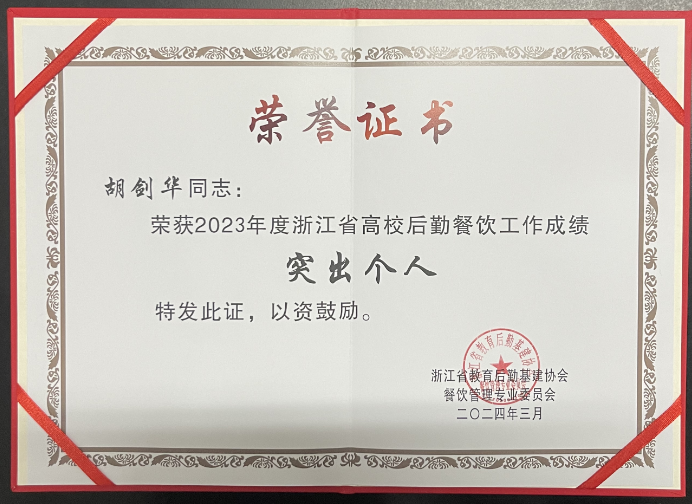为鼓励和表彰在高校餐饮管理工作中做出积极贡献的先进个人,引领和推动高校后勤的发展和进步,近日,浙江省教育后勤基建协会对全省教育后勤系统2023年度餐饮工作先进个人进行了表彰颁奖。学校公共管理处胡剑华老师荣获“2023年度浙江省高校后勤餐饮工作成绩突出个人”称号。