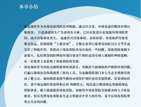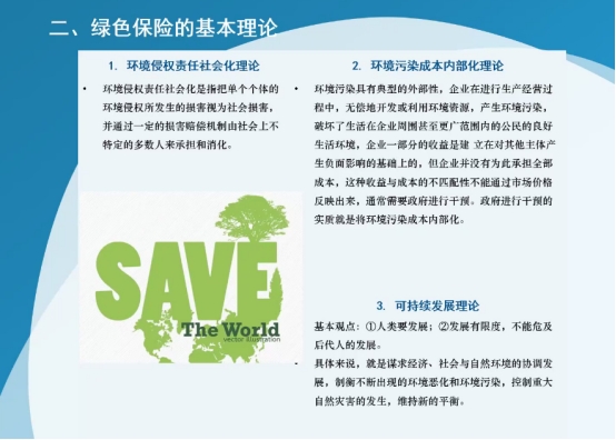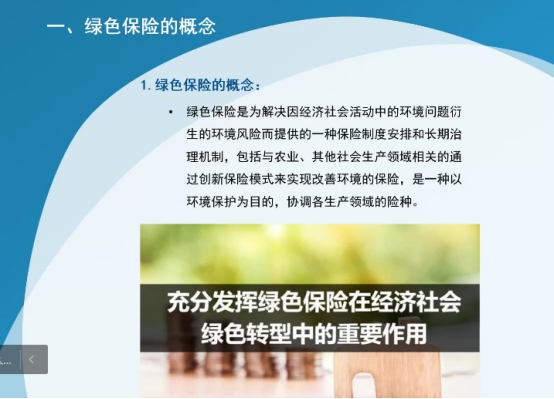 杜斐烨老师讲到绿色保险理论分为环境侵权责任社会化理论、环境污染成本内部化理论、可持续发展理论三种,并指出绿色保险具有公益性、政策性和环境友好性的特征以及对绿色保险的概念进行解释,指出充分发挥绿色保险在经济社会绿色转型中的重要作用。