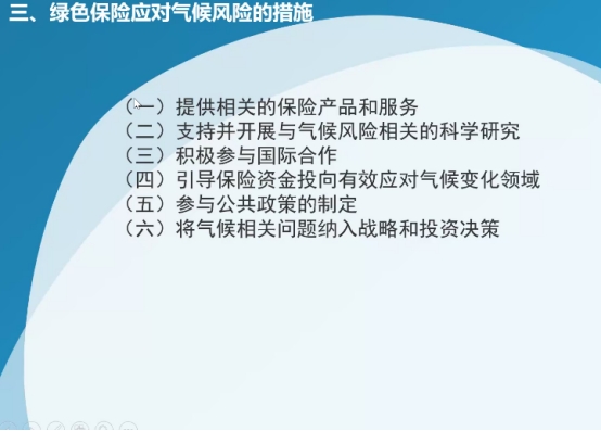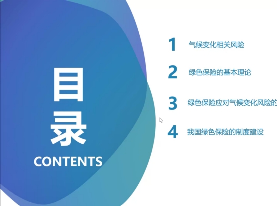 本次讲座分为气候变化相关风险、绿色保险的基本理论、绿色保险应对气候变化风险的功能、我国绿色保险的制度建设四个部分。