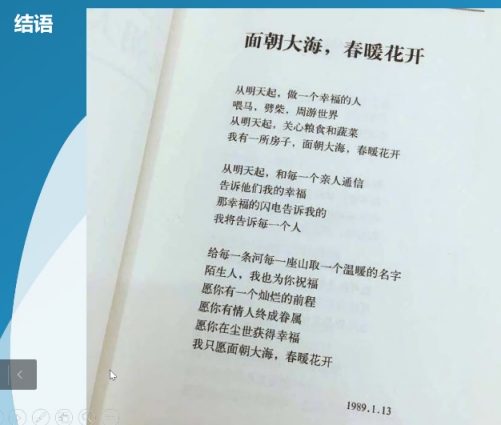 在讲座最后,杜斐烨老师以《面朝大海,春暖花开》作为本次讲座的结语,希望同学们能够在未来的生活中继续研读,产生不同的感悟。与此同时,祝愿同学们能够有光明的前程。