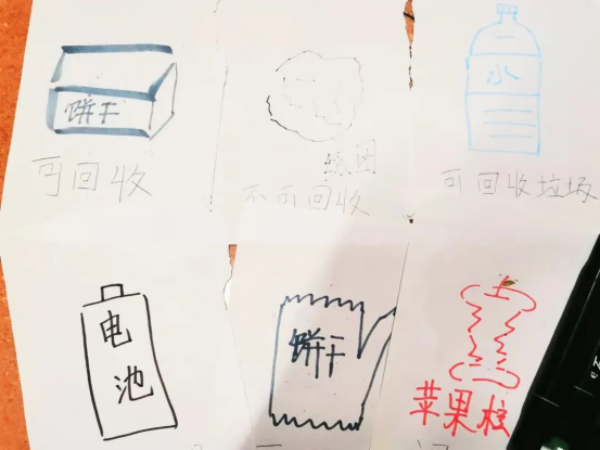 小朋友的画作都非常贴近生活,将生活中常见的垃圾都画出来,互相交换,互相猜。几乎所有孩子都能区分生活中常见的垃圾。